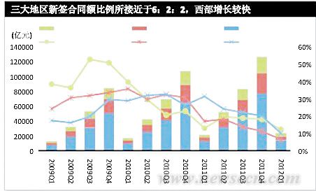 從增速來(lái)看,東部地區(qū)新簽合同額增速同比放緩21.4%,中部地區(qū)新簽合同額增速同比放緩10.5%,西部地區(qū)新簽合同額增速同比放緩11.2%。