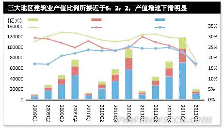 從已發(fā)布的2012年第一季度全國(guó)各省份建筑業(yè)產(chǎn)值來(lái)看,東部地區(qū)、中部地區(qū)和西部地區(qū)的建筑業(yè)產(chǎn)值分別為11009.2億元、4353.5億元和3468.0億元;從新簽合同額來(lái)看,東部地區(qū)、中部地區(qū)、西部地區(qū)今年第一季度新簽合同額分別為14716.6億元、5217.6億元、4180.1億元。由以上數(shù)據(jù)可以看出,我國(guó)建筑業(yè)呈不均衡性發(fā)展,3個(gè)地區(qū)新簽合同額比例接近6:2:2,東強(qiáng)西弱的格局依然沒變。